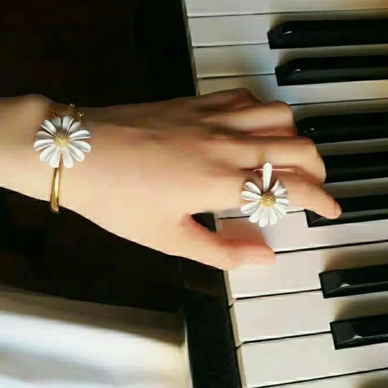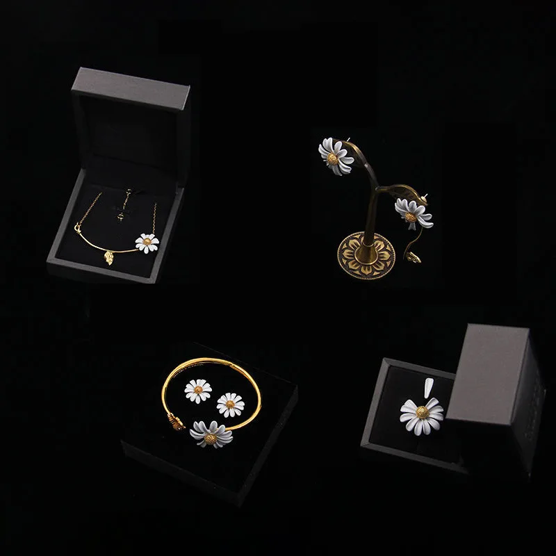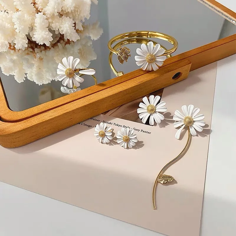 Details: Daisy-themed jewelry set. Daisy represents purity, innocence, new beginnings, joy, and cheerfulness. Daisy petals symbolize innocence and are commonly associated with childhood memories of collecting wildflower bouquets.