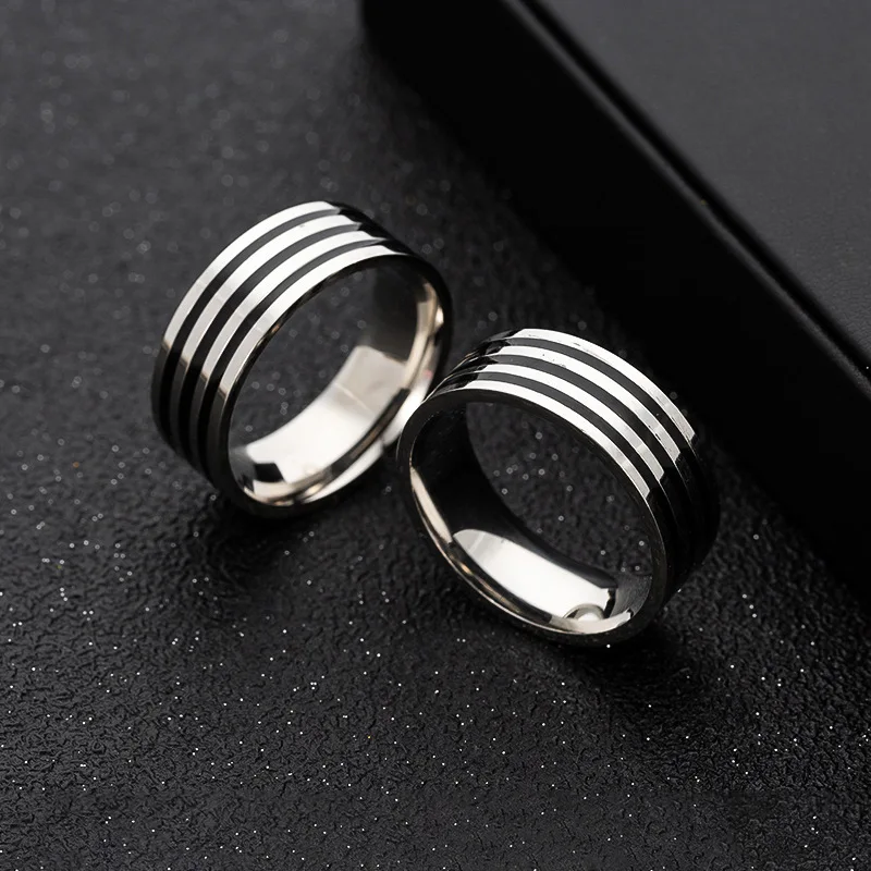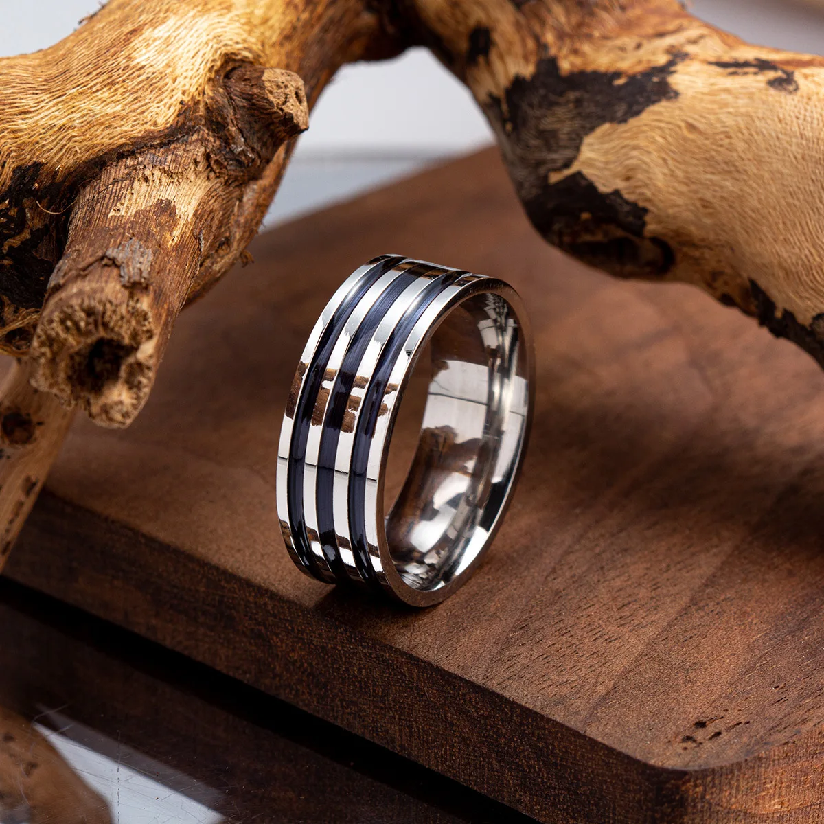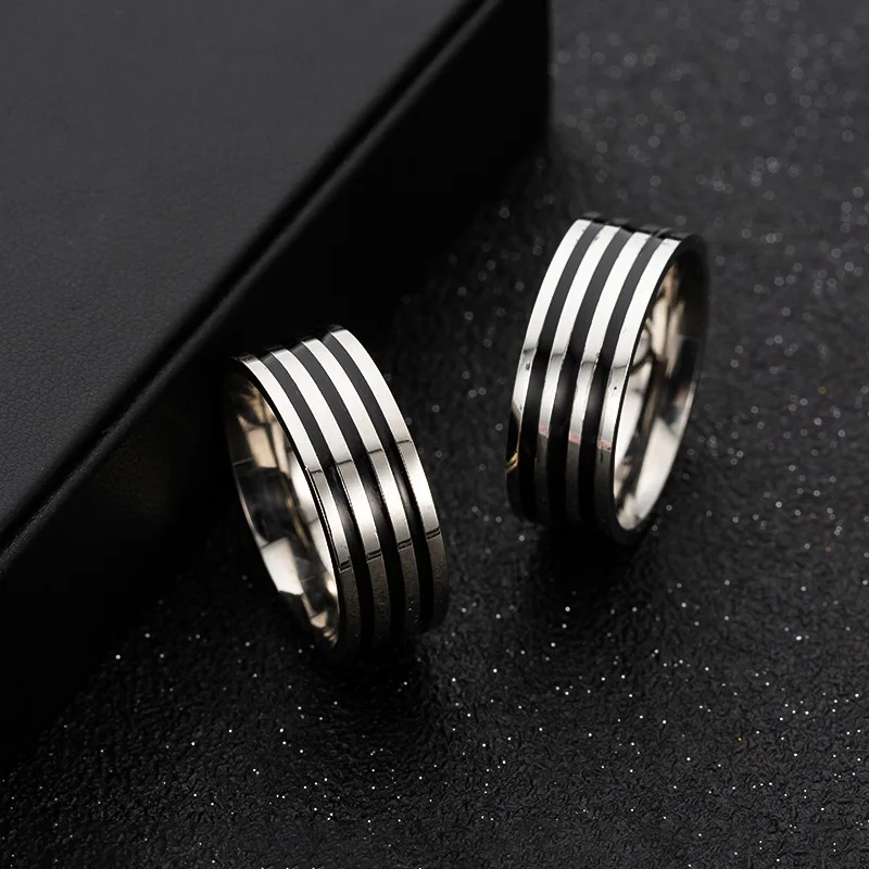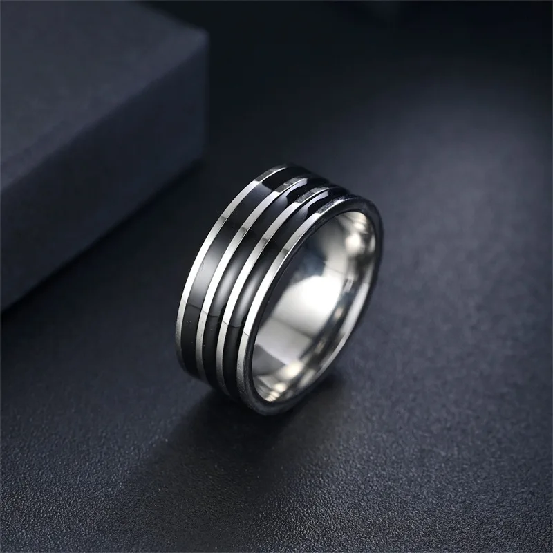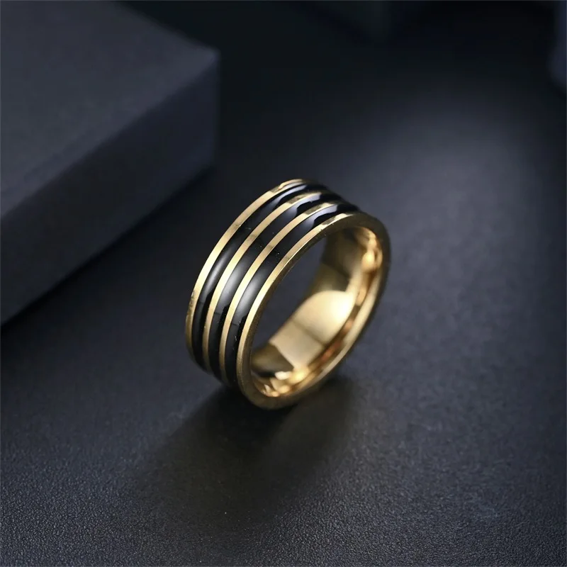 Details: A study in contrast and confidence. This ring fuses golden warmth or silvery coolness, framed by sleek black stripes that evoke precision and power. Crafted from durable titanium steel, it’s a statement of modern masculinity — refined, resilient, and unapologetically bold. Whether worn solo or stacked, it commands attention without saying a word.
