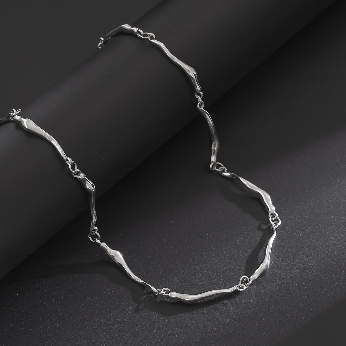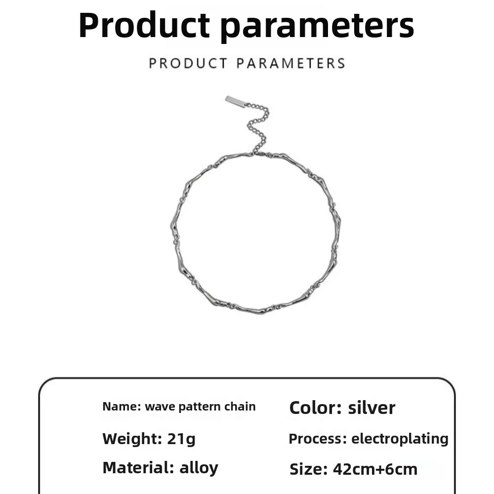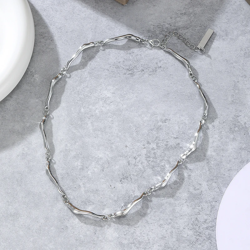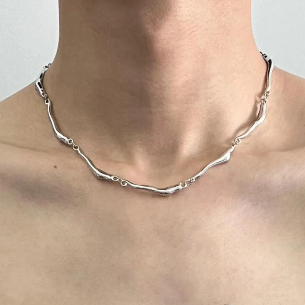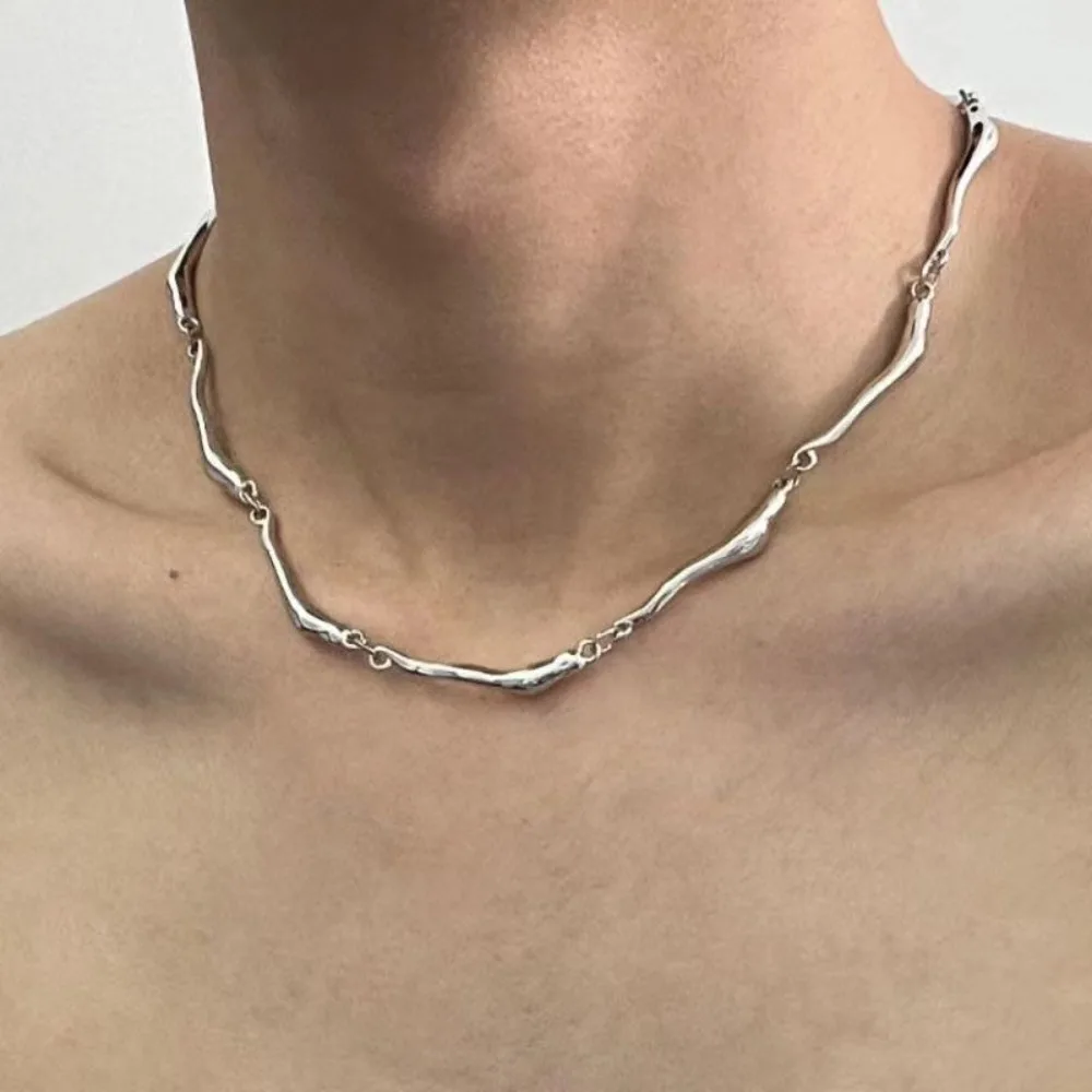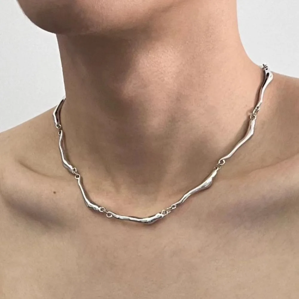 Details: Bold yet refined, the Wavy Warp Clavicle Chain Necklace is a striking piece designed for both men and women who appreciate artistry in everyday style. Crafted in polished alloy, its irregular, organically twisted links evoke the fluidity of waves and the raw beauty of natural forms. Each link connects seamlessly, creating a sculptural chain that rests elegantly along the collarbone. Its unisex design makes it versatile, pairing effortlessly with minimalist outfits for a modern edge or layered with other chains for a fashion-forward look. Lightweight yet substantial, it’s perfect for those who want to carry a touch of avant-garde sophistication wherever they go.
