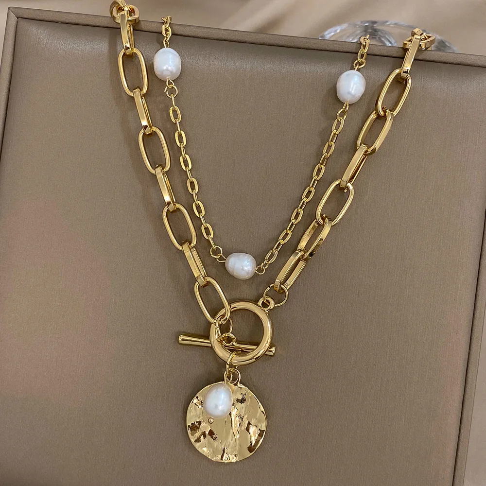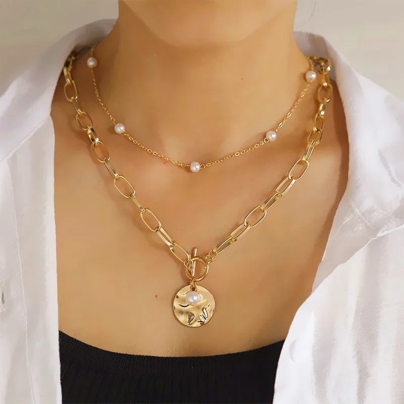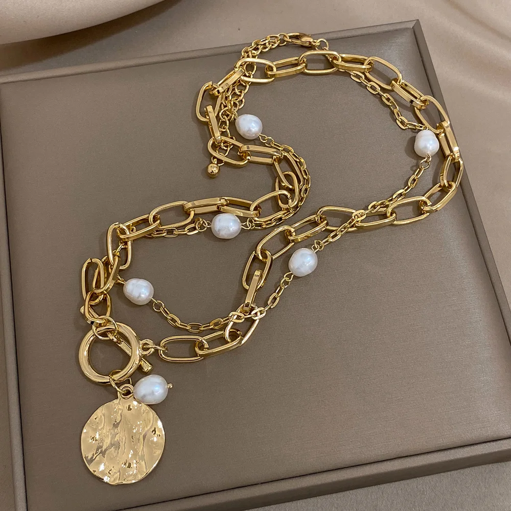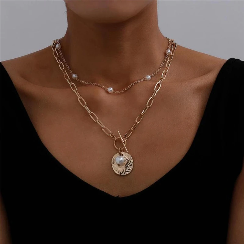 Details: The golden necklaces feature baroque faux pearls with unique, irregular shapes, adding a touch of whimsy to the sophisticated design. The central coin pendant shines with intricate embossing, making it a classic piece that commands attention. The silvery necklace harmonizes modern style with classic elegance. The irregularly shaped baroque faux pearls provide a playful contrast to the radiant coin pendant, creating a layered look of refined beauty. Both necklaces embody the essence of baroque sophistication, with their layered chains and eye-catching pendants. They are versatile pieces that can elevate any outfit, reflecting a timeless, bold, and graceful elegance. Whether worn separately or together, these necklaces will make a statement.
