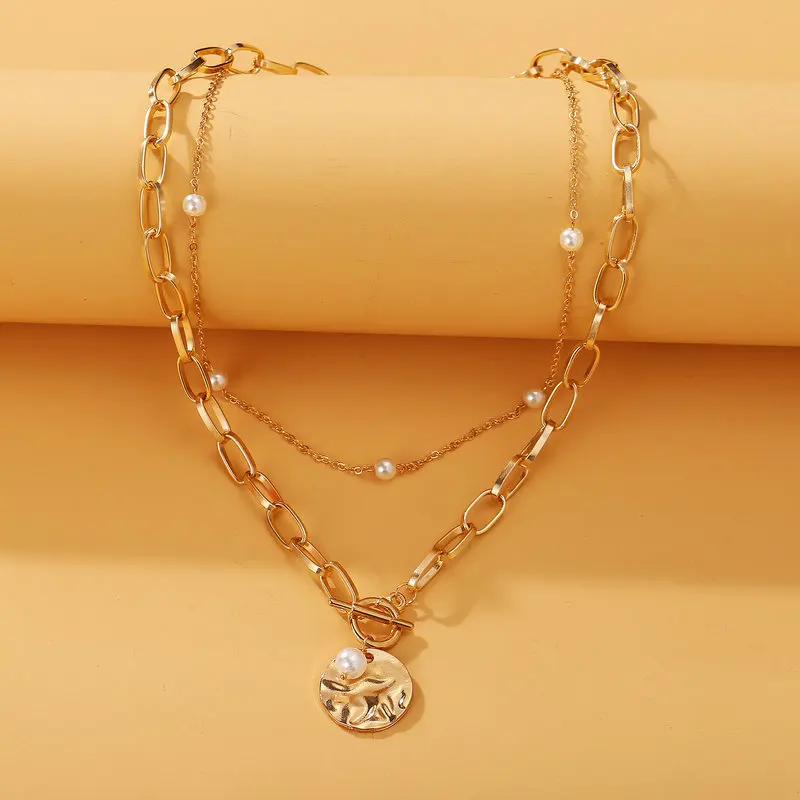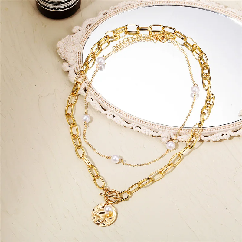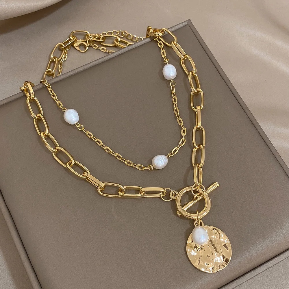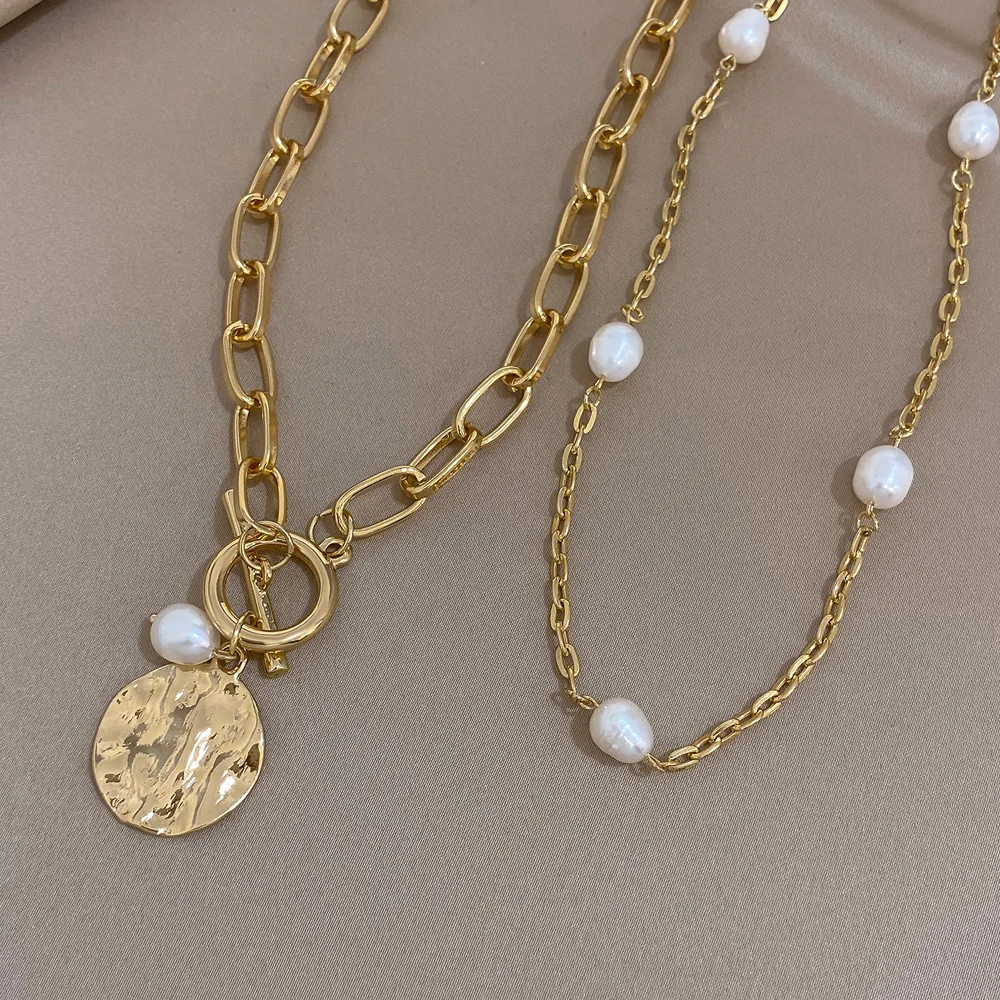 Details: The golden necklaces feature baroque faux pearls with unique, irregular shapes, adding a touch of whimsy to the sophisticated design. The central coin pendant shines with intricate embossing, making it a classic piece that commands attention. The silvery necklace harmonizes modern style with classic elegance. The irregularly shaped baroque faux pearls provide a playful contrast to the radiant coin pendant, creating a layered look of refined beauty. Both necklaces embody the essence of baroque sophistication, with their layered chains and eye-catching pendants. They are versatile pieces that can elevate any outfit, reflecting a timeless, bold, and graceful elegance. Whether worn separately or together, these necklaces will make a statement.